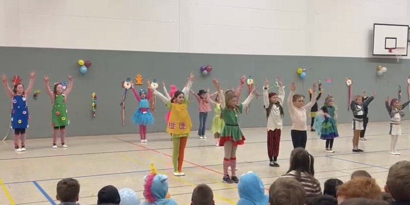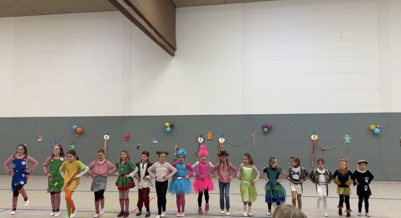 Weiberfastnacht haben wir mit den Kindern in den Klassen und der Sporthalle gefeiert. Das Prinzenpaar hat uns besucht und mit allen eine Polonaise durch die Schule gemacht.