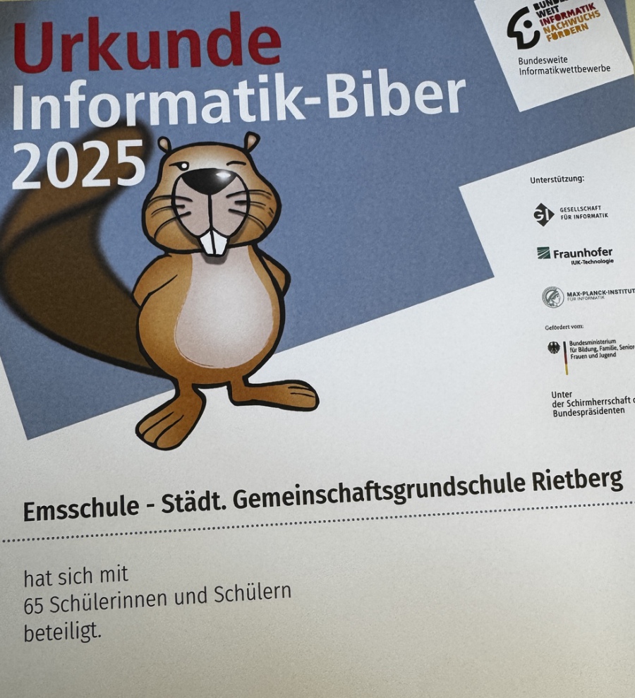 65 Kinder der Emsschule haben am letzten Durchgang des Informatik-Biber-Wettbewerbs teilgenommen - 2 Kinder konnten einen ersten Platz erreichen - wir gratulieren und freuen uns!